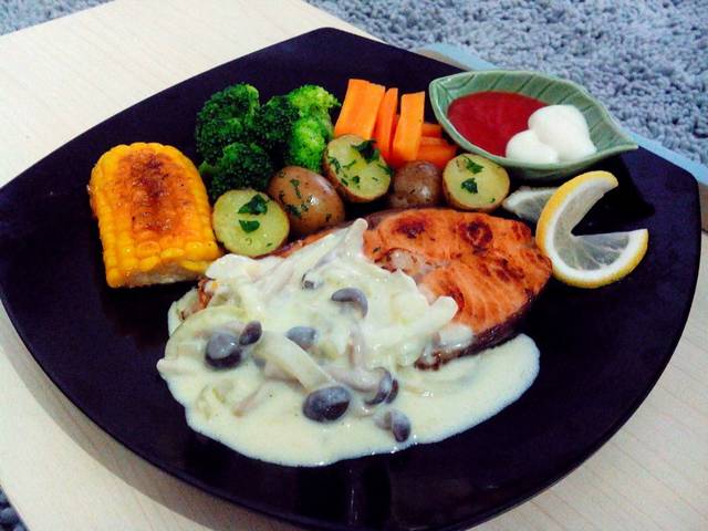 Sumber:https://cookpad.com/id/resep/1413256-salmon-steak-white-gravy-with-mushroom